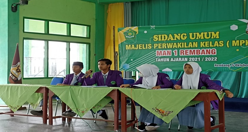 Majelis Perwakilan Kelas (MPK) MAN 1 Rembang menetapkan 4 bakal calon ketua Organisasi Siswa Intra Madrasah (OSIM) periode 2022-2023 dalam sidang umum MPK yang digelar pada hari Rabu (5/10/2022) di aula.